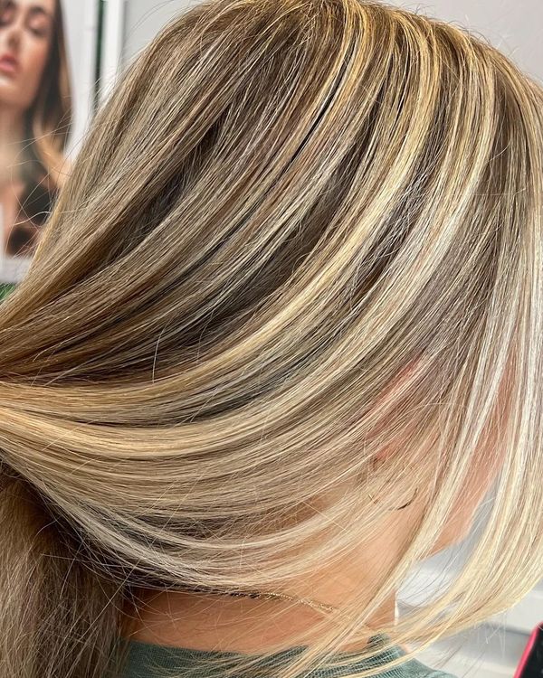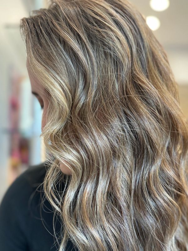 Highlights focused around the face and down the part. Includes bond builder, glaze, and blow dry.